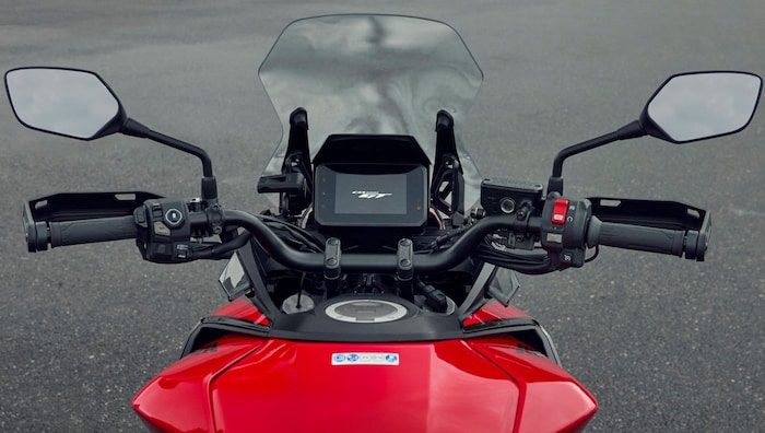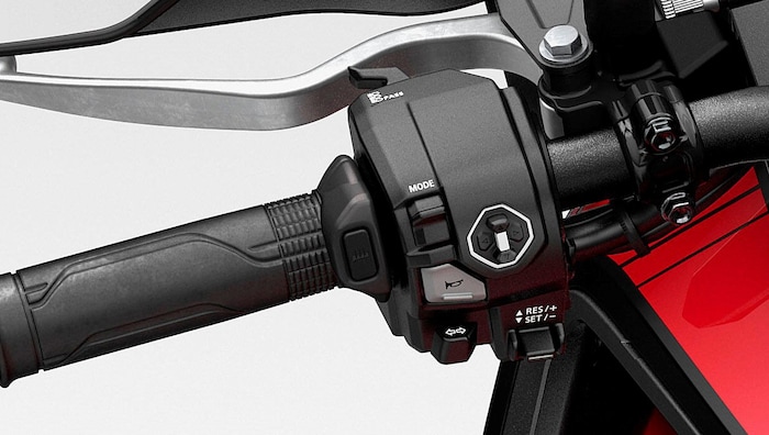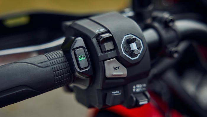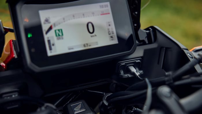Das Cockpit mit 5-Zoll-TFT-Display erlaubt dank Hondas Roadsync Konnektivitätsfunktionen wie Navigation oder in Kombination mit Head-Set-Helm auch Telefonie. Für das verbundene Smartphone ist eine USB-Ladebuchse an Bord.