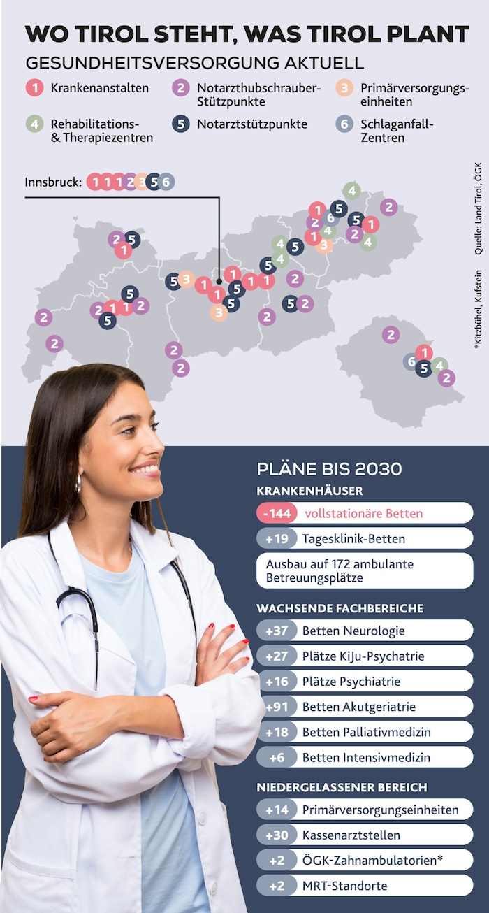 Die Gesundheitsversorgung in Tirol wird im großen Stil umgekrempelt. Am Donnerstag stellten Land, ÖGK und Gesundheit Österreich GmbH die Pläne vor. Diese bringen in Spitälern und im Bereich ärztliche Versorgung am Land einige Änderungen.