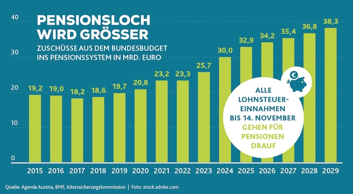Austria has an expensive pension system - at around 33 billion euros, it is the largest item in the federal budget. Until November 14, all income tax revenue will be used for this. This date is likely to be pushed back even further: The gap will grow to 38 billion euros by 2029, despite reforms.