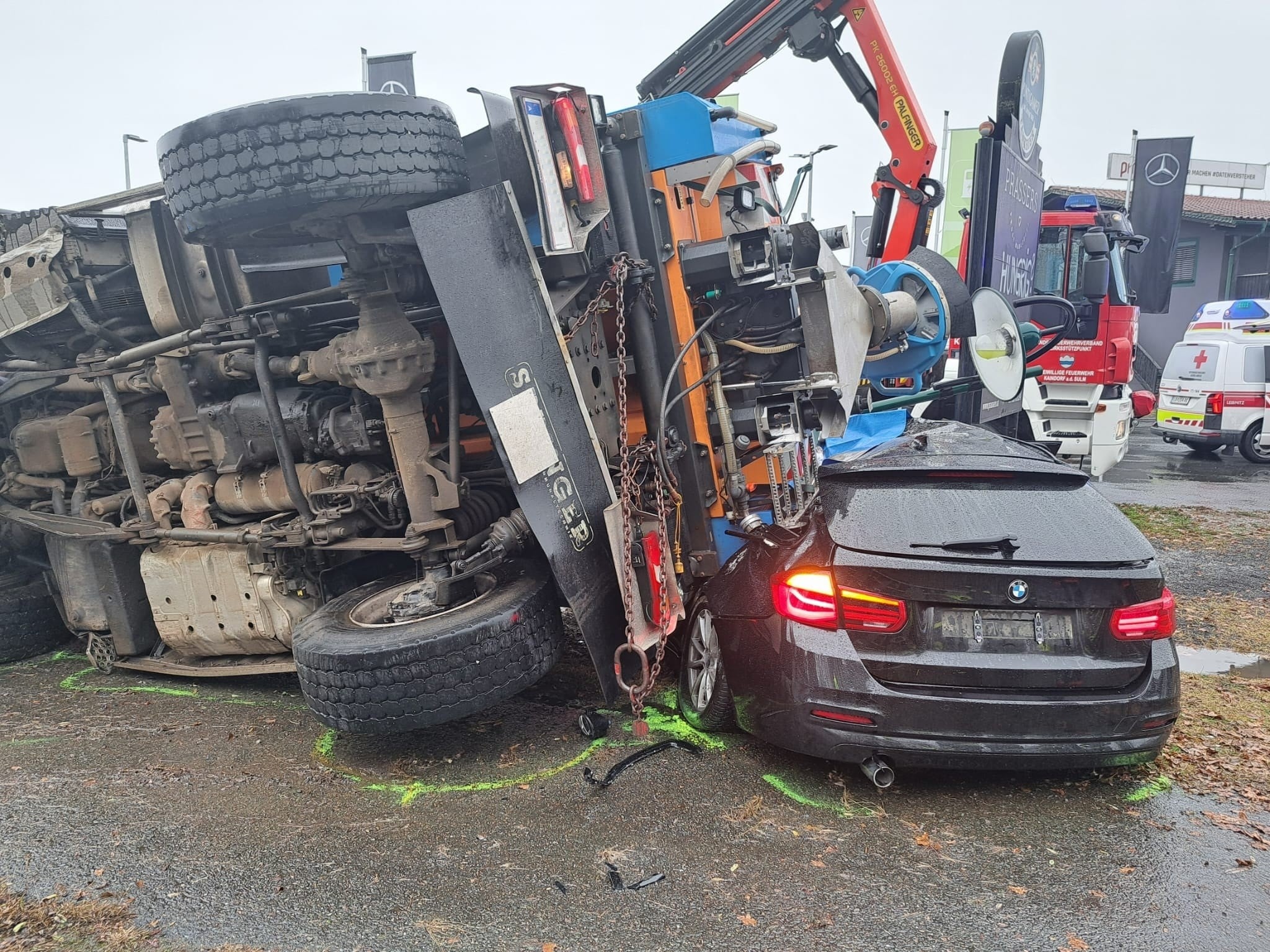 Auf Höhe eines Autohauses verlor der Lkw-Lenker aus bisher ungeklärter Ursache die Kontrolle über sein Fahrzeug und kollidierte mit dem entgegenkommenden Pkw. Durch die Wucht des Aufpralls kippte die Zugmaschine auf das Auto und klemmte den 56-Jährigen im Fahrzeug ein.