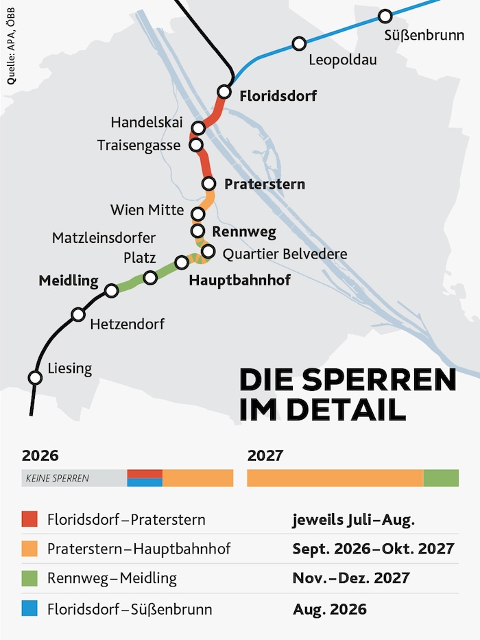 Das kommende Jahr wird für Öffi-Fahrer in Wien und um Umland wird also garantiert kein Honig lecken. Denn es ist eine Operation am offenen Herzen. Die S-Bahn-Stammstrecke wird komplett gesperrt, und zwar gleich für 14 (!) Monate. Zwischen Praterstern und Hauptbahnhof werden ab 1. September 2026 bis 31. Oktober 2027 keine Züge fahren. Anschließend von Rennweg bis Meidling – und zwar bis zum 31. Dezember 2027 (siehe Grafik). Wie bereits in den Jahren zuvor wird die Strecke im Juli und August 2026 zwischen Floridsdorf und Praterstern für die Züge gesperrt.