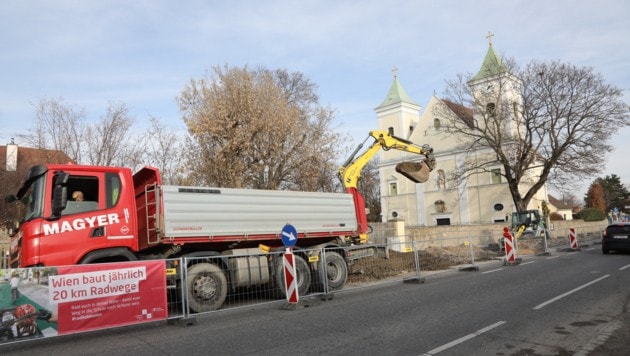 Vor der Pfarrkirche St. Anna Breitenlee sorgt die Baustelle für einen Radweg für Ärger. Parkplätze verschwinden, Zugänge werden eng, Eltern und Kirchenbesucher schlagen Alarm.