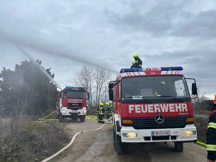 Während die Kameraden aus Frauenkirchen, Gols, Mönchhof, Halbturn, Podersdorf am See und St. Andrä am Zicksee die Flammen bekämpften und auch die Schwierigkeit einer lang ausgelegten Löschleitung bravourös meisterten, mussten die angereisten Feuerwehrtaucher zwei angeblich ins Wasser gestürzte Quads finden und bergen.