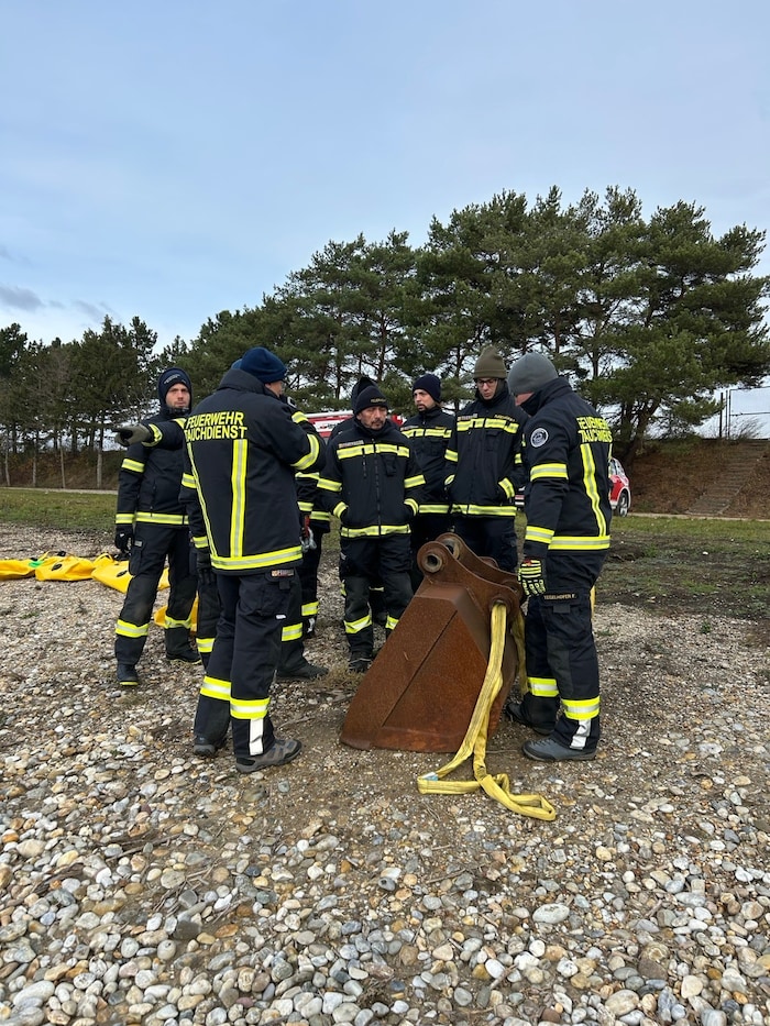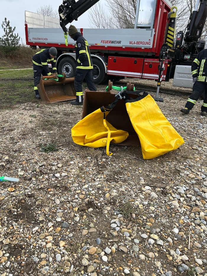 Per Radialsuche, bei der die Taucher mit Kameraden an Land mit einer Leine verbunden sind, wurden die Baggerschaufeln schnell gefunden. Mittels Hebekissen wurden sie wieder an die Oberfläche gebracht. Aus dem Wasser holte sie dann ein Fahrzeug der Feuerwehr Frauenkirchen.