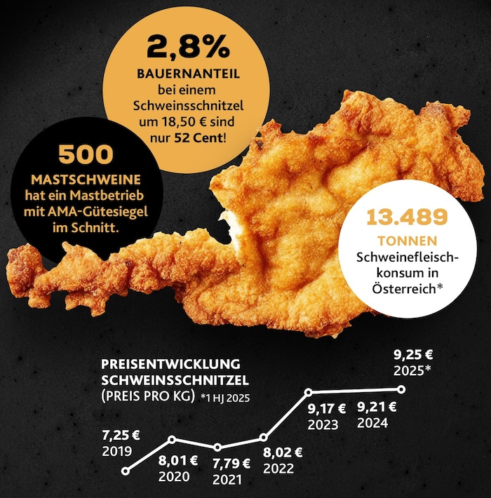 Wie aktuelle Zahlen von AMA, Landwirtschaftskammer und Co. belegen. Bei einem im Restaurant verzehrten Schweinsschnitzel mit einem durchschnittlichen Verbraucherpreis von 18,50 Euro beträgt der rechnerische Bauernanteil magere 52 Cent (netto!) oder 2,8 Prozent. Dieser sinkt übrigens kontinuierlich.