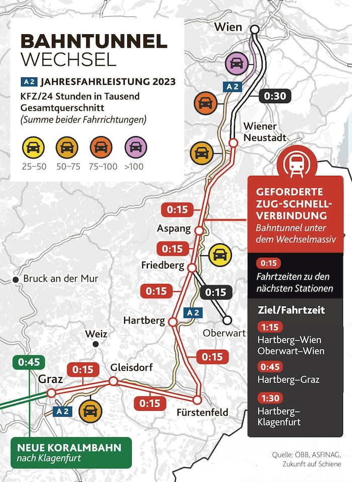 Vor diesem Hintergrund nützt die grenzüberschreitende Initiative „Zukunft auf Schiene“ das Jubiläumsjahr, um eine Forderung zu präsentieren: einen Bahntunnel unter dem Wechselmassiv. Sprecherin Jutta Spitzmüller sagt: „Wenn wir 100 Jahre vorausdenken, müssen wir heute die Chance nützen, ein modernes öffentliches Verkehrskonzept für den Südosten zu schaffen.“