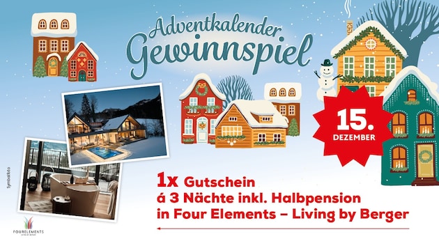 Im heutigen „Krone“-Adventkalender versteckt sich Ihre Auszeit vom Alltag inmitten unberührter Natur. Wir verlosen einen Gutschein für drei Nächte im exklusiven Hideaway FourElements-Living by Berger inklusive Halbpension im grünen Herzen Österreichs zwischen den zwei Nationalparks Gesäuse und Kalkalpen. Gleich mitspielen und Gewinnchance nutzen.