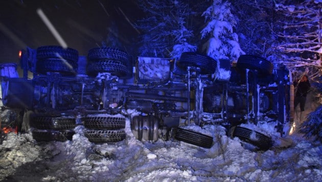 Die winterlichen Verhältnisse sorgen für Chaos auf den Straßen, so auch am späten Mittwochabend. Während der Talfahrt verlor ein Lenker in Tirol die Kontrolle über einen Betonmischer – das Fahrzeug stürzte um.