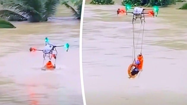 Mithilfe einer Drohne haben Rettungskräfte in der vietnamesischen Provinz Dak Lak kürzlich einen Fischer nach Stunden aus den reißenden Fluten eines Flusses gerettet (siehe Video oben).