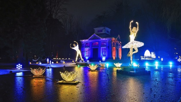 Dass all das funktioniert, ist nicht selbstverständlich. „Wir haben ein großes Technikteam, das das ganze Jahr über daran arbeitet, dass die Musik mit dem Licht interagiert“, beschreibt Lumagica-Projektleiter Dominik Hoflach, wie viel Know-how MK Illumination, das Unternehmen hinter den Lichterparks, investiert. Bei der Führung durch den Hofgarten bleibt er vor einem seiner Highlights stehen: Mitten im See ziehen zwei funkelnde Balletttänzer die Besucher in ihren Bann.
