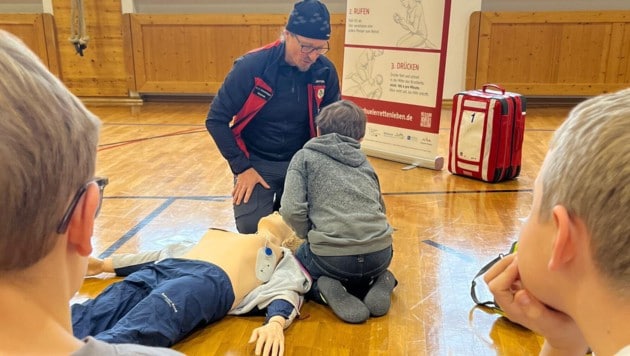 Die Bergrettung Leutasch (Bezirk Innsbruck-Land) schulte kürzlich Kinder der dritten und vierten Klasse der örtlichen Volksschule in Wiederbelebung und im richtigen Einsatz eines Defibrillators. Die Lebensretter von morgen zeigten dabei großen Wissensdurst.