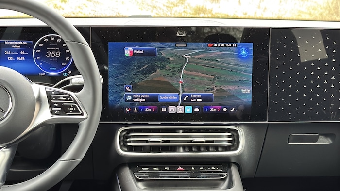 Die Materialanmutung ist durchwachsen. Die riesige Glasfläche entspricht dem aktuellen Mercedes-Verständnis von Luxus, entbindet aber mehr oder weniger davon, ein Armaturenbrett zu gestalten und mit ansprechenden Materialien zu versehen. Unterhalb besteht alles aus hartem Plastik, auch der Unterteil der schwebenden Mittelkonsole. Vor allem diese fühlt sich billig an, weil sie hohl wirkt und dieser Hohlraum auch noch das Kratzgeräusch verstärkt, wenn man mit den Fingernägeln drankommt.