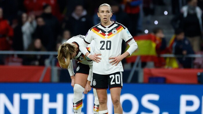 Nachdem die Deutschen im Hinspiel am Freitag unglücklich nur 0:0 gespielt hatten, hielten sie sich auswärts eine Stunde lang schadlos. Dann schlugen die ohne die verletzte Weltfußballerin Aitana Bonmati angetretenen Spanierinnen innerhalb einer Viertelstunde dreimal zu.
