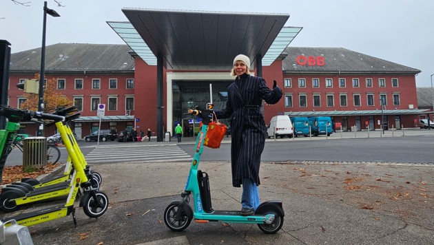Auch am Klagenfurt Bahnhofsplatz steigt sie dann auf den Scooter. „Mein Büro ist nicht weit weg, ich mache die Reise mit dem Scooter jeden Arbeitstag. Verspätungen gibt es keine. Ich hab mir ein Kärnten Ticket gekauft, mit dem ich die S-Bahn und die Regionalverbindungen gratis nutzen kann. Ich bin auch extra zum Weihnachtsmarkt nach Lienz gefahren, alles hat super geklappt.“