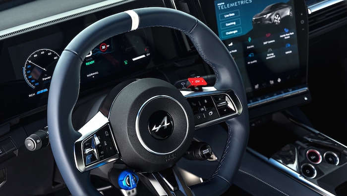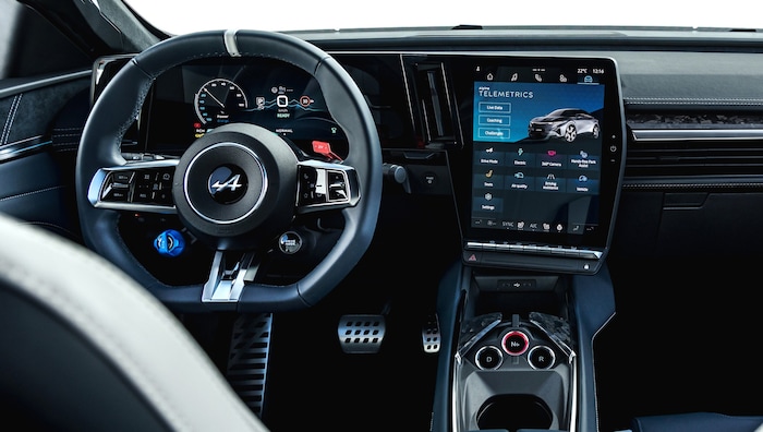 Der Innenraum der A390 ist der Sportlichkeit gewidmet – mit Leder an Armaturenbrett, Mittelkonsole und Türverkleidungen sowie einer stimmungsvollen Beleuchtung. Das Cockpit zeigt sich fahrerorientiert: Die beiden Displays sind dem Fahrer zugewandt. Das beheizbare Sportlenkrad ist mit blauem Nappaleder überzogen und verfügt über eine flache Unterseite und eine Mittelachse mit den Bedienelementen für Fahrmodi, Assistenzsysteme, Telefon, Sprachassistent und Instrumentenanzeige. Die hohe Mittelkonsole ist vom ikonischen Design der A110 inspiriert.