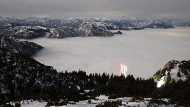 Es war bereits dunkel, am Berg herrschten winterliche Verhältnisse und im Tal lag eine dichte Nebeldecke, als zwei Wanderer den Notruf absetzen mussten. Die beiden 22-Jährigen waren beim Abstieg vom Traunstein in Bergnot geraten. Der Einsatz war für die Helfer samt Hubschrauber alles andere als einfach.