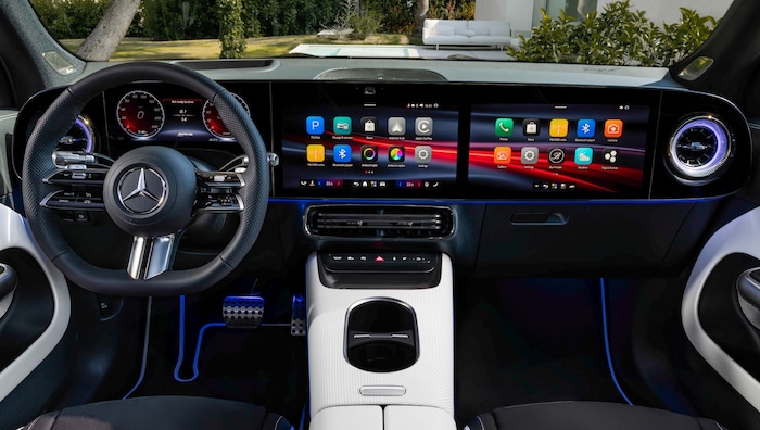 Innen dominiert der MBUX-Superscreen, wie man ihn auch vom CLA kennt. Drei Displays hinter einer einzigen Glasfläche, angetrieben vom neuen MB.OS-System, samt Over-the-Air-Updates und KI-Funktionen. Eine „schwebende“ Mittelkonsole mit großer Ablage trennt Fahrer und Beifahrer. Zusätzlicher Stauraum findet sich in den Türen oder in der ausklappbaren Mittelarmlehne in Reihe zwei.