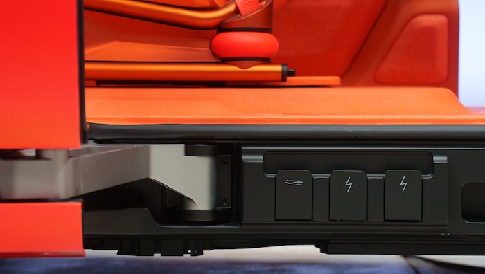 Dass etwa zwei reguläre Steckdosen fürs bidirektionale Laden in der Seitentürleiste im Fahrzeugboden eingelassen sind, ist das eine. Daneben allerdings ist ein Anschlussventil, an das Schläuche zum Aufpumpen der Bordmatratzen oder von Bällen angeschlossen werden können. Eine wirklich clevere Idee.