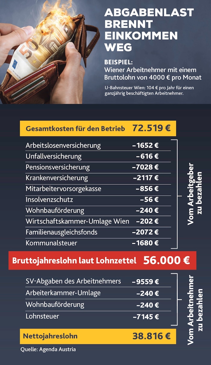 Beispiel: Ein (Wiener) Arbeitnehmer mit einem Monatsgehalt von 4000 Euro brutto kostet seiner Firma 72.500 Euro jährlich (siehe Tabelle unten). Davon abgezogen werden 16.500 Euro Lohnnebenkosten, die der Arbeitgeber trägt. Das ergibt 56.000 Euro, das steht am Lohnzettel. Davon fallen dann SV-Abgaben und ebenso die AK-Umlage sowie die Lohnsteuer von 7100 Euro an. „Am Ende bleibt ein Netto von 38.800 Euro“, betont Denes Kucsera vom Thinktank Agenda Austria.
