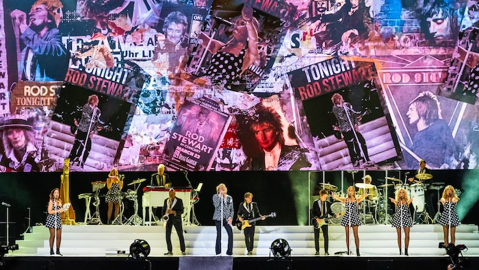 Das Grundprogramm ist für einen Mann seines Alters unglaublich. Gleich die ersten sechs Songs gehen in die Vollen und lassen wenig Raum zum Verschnaufen. Bei „Tonight I’m Yours (Don’t Hurt Me)“ reißt es die ersten Hardcore-Fans in der ersten Reihe vor der Bühne von den Sitzen, „Some Guys Have All The Luck“ bringt die Party endgültig auf Betriebstemperatur und beim Rock’n’Roll-Stampfer „Twistin‘ The Night Away“ wirbeln die fünf Damen in schwarz-weiß-karierten Röcken über die Bühne, während Rod mit schelmischem Grinsen und gewohnt blondgefärbter Wildmähne das tut, was er seit seinem Karrierebeginn vor mehr als 60 Jahren am besten kann – den Buben mit dem ständigen Schalk im Nacken mimen. Während ihm aus dem Publikumsbereich Schottland- und Celtic Glasgow-Fahnen entgegenwehen, flucht der Chef des Abends sympathisch, aber wie ein Rohrspatz über einen ausgefallenen Ventilator. Eine Szene, sinnbildlich für diese Legende: Zwischen kultigem Rockstar und spitzbübischer Rotzpippen verschwimmen die Grenzen oft ins Unsichtbare.