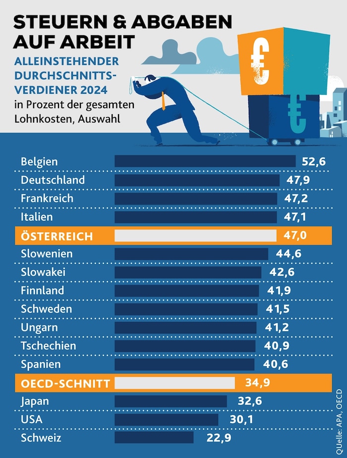 47 Prozent geben im Schnitt Arbeitnehmer und Arbeitgeber an den Staat ab, ein Spitzenplatz im OECD-Vergleich. Nur in Belgien greift der Staat noch deutlich mehr zu, in Italien, Frankreich und Deutschland ist das Niveau sehr ähnlich.