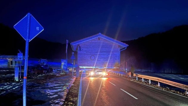 Sowas sieht man nicht alle Tage: Im deutschen Ort Balderschwang, direkt über der Grenze zu Vorarlberg, wurde am Donnerstag eine Polizeistreife auf einen Tieflader aufmerksam, der ein ganzes Blockhaus geladen hatte und mit der unhandlichen Fracht an mehreren engen Stellen im Ort hängenblieb.