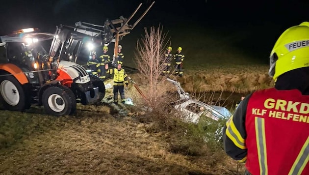 „Nach der Rettung der verletzten Personen begannen wir mit der Fahrzeugbergung. Mithilfe der Seilwinde des Rüstlöschfahrzeugs Helfenberg sowie des Gemeindetraktors konnte das schwer beschädigte Fahrzeug aus dem Teich gezogen werden“, so die Helfeberger Helfer. Erschwert wurde die Bergung durch das Befestigen des Fahrzeugs unter Wasser sowie durch die steile Böschung des Teiches. Nach fast zwei Stunden war die Bergung des schwerst beschädigten Fahrzeugs sowie die Reinigung der Geräte abgeschlossen.