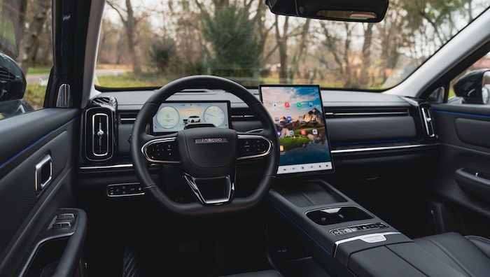 Aber erst einmal zu den Fakten. Der Jaecoo 7 ist ein kompaktes Elektro-SUV, das für deine 4,50 Meter Länge und den Radstand von 2,67 Meter erstaunlich viel Platz im Innenraum bietet. Auf der Rückbank geht es geradezu luftig zu. Der Kofferraum ist vergleichsweise mickrig: Hinter die in der Topausstattung elektrisch angetriebenen Heckklappe passen 340 bzw. 1265 Liter – das ist Kleinwagenformat. Hintergrund: In China ist der Platz für die Insassen grundsätzlich wichtiger als der fürs Gepäck.