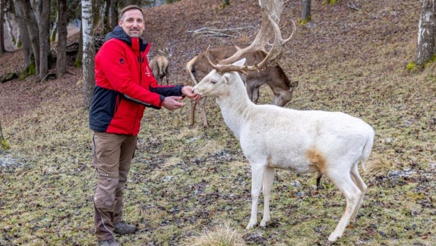 Das Herz geht einem auf beim Anblick der sichtlich glücklichen Tiere, die hier unter liebevoller Obhut des Aiderbichl-Teams wohlbehütet wie artgerecht leben. Und wie auf Befehl streckt eine mächtige Sau Markus Leitner ihren Rüssel entgegen, der das Borstentier, mit dem der Mensch soviel Schindluder treibt, liebevoll krault. Im Wortsinn Schwein gehabt, haben derzeit mehr als 9000 Tiere in Not, die Aiderbichl als eine der wichtigsten Tierschutzorganisationen Europas auf einem von rund 30 Gnadenhöfen in sechs Ländern betreut – nun auch die Damhirsche vom Wörthersee. „Sie haben die Übersiedelung sehr gut überstanden“, betont Leitner, während der prächtige „Hermes“ aus seiner Hand frisst. „Jetzt haben wir einen zweiten weißen Hirsch“, sagt er und zeigt auf die fünf entspannten Neuankömmlinge.