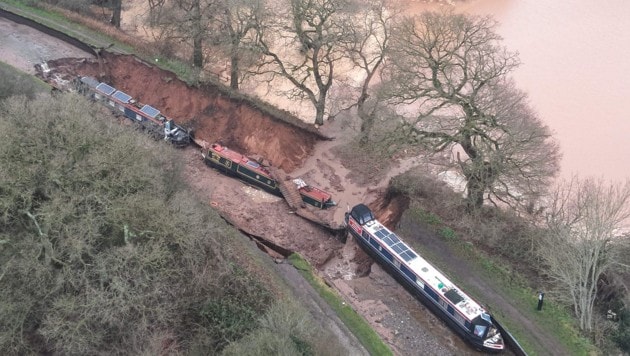 In Großbritannien ist am Montag die Wand eines Kanals eingestürzt. Zwei Schiffe sind in einem Erdloch versunken und ein Feld wurde überflutet. Dutzende Menschen sitzen nun über Weihnachten fest.