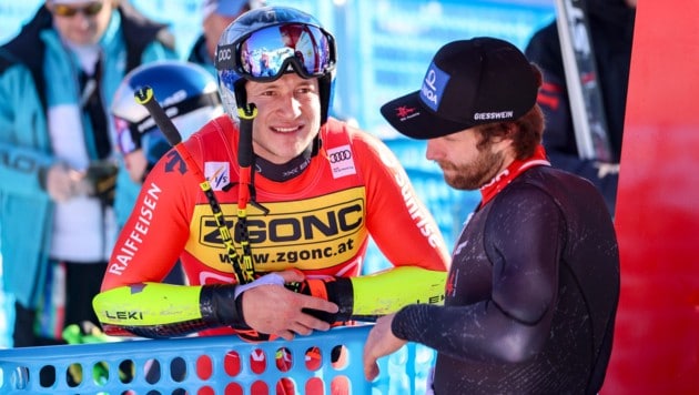 „Jetzt“, flüsterte Marco Odermatt dem Sieger Marco Schwarz bei der Umarmung im Ziel ins Ohr: „Jetzt stellst die Slalom-Ski aber ins Eck!“