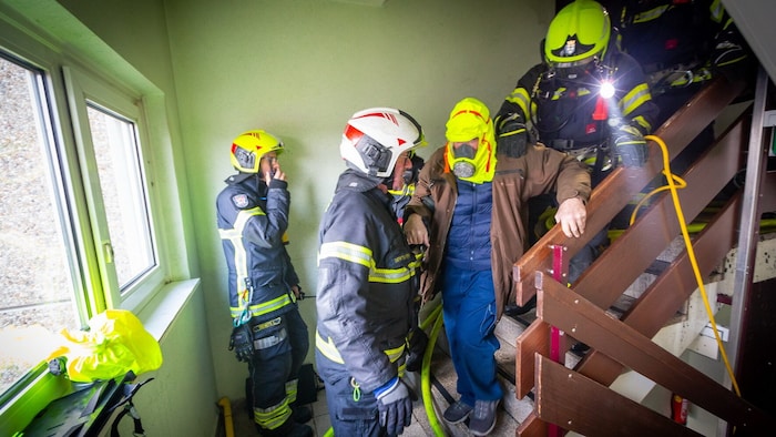 Zum Zeitpunkt des Brandausbruchs befanden sich laut Feuerwehr rund 30 Personen und einige Haustiere im Gebäude. Acht Feuerwehren mit rund 170 Kameraden waren gefordert. Sie konnten die teils in ihren Wohnungen eingeschlossenen Bewohner mit Fluchtfiltermasken aus dem verrauchten Inneren ins Freie bringen und ein Übergreifen der Flammen auf weitere Wohnungen verhindern. Dazu mussten teils die Eingangstüren gewaltsam geöffnet – und später wieder provisorisch verschlossen werden. Auch die Tiere konnten gerettet werden. Insgesamt vier Personen mussten mit Verdacht auf Rauchgasvergiftung ins Krankenhaus gebracht werden, der Rest konnte im Kindergarten betreut werden.