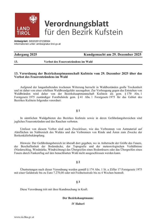 Das Abfeuern von Feuerwerkskörpern ist freilich ebenso verboten. Vom Verbot umfasst sind auch Zweckfeuer, wie das Verbrennen von Astmaterial auf Almflächen. Die entsprechenden Verordnungen gelten bis auf Widerruf bis jedenfalls in die erste Jännerwoche. „Ich appelliere vor allem an die Eigenverantwortung der Bevölkerung und unserer Gäste: Schützen Sie sich selbst, ihre Mitmenschen und unser Land Tirol. Nicht Verbote schützen unsere Wälder und Felder, sondern Ihr verantwortungsvolles Handeln“, so LH Anton Mattle.
