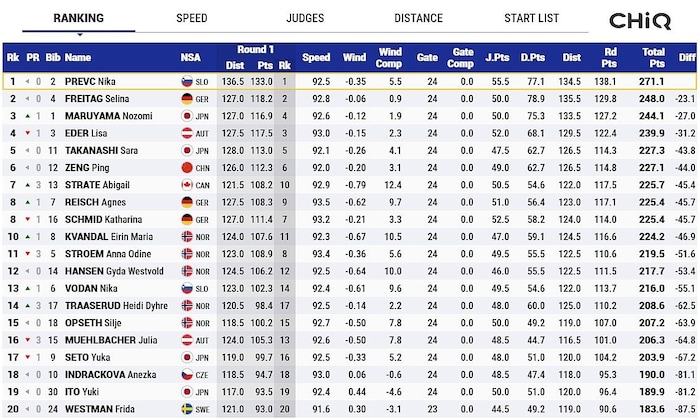Den Sieg holte sich in überlegener Manier die Slowenin Nika Prevc (136,5/134,5 m) mit 271,1 Zählern vor der Deutschen Selina Freitag (-23,1 Pkt.) und Nozomi Maruyama aus Japan (-27,0). Julia Mühlbacher wurde 16.