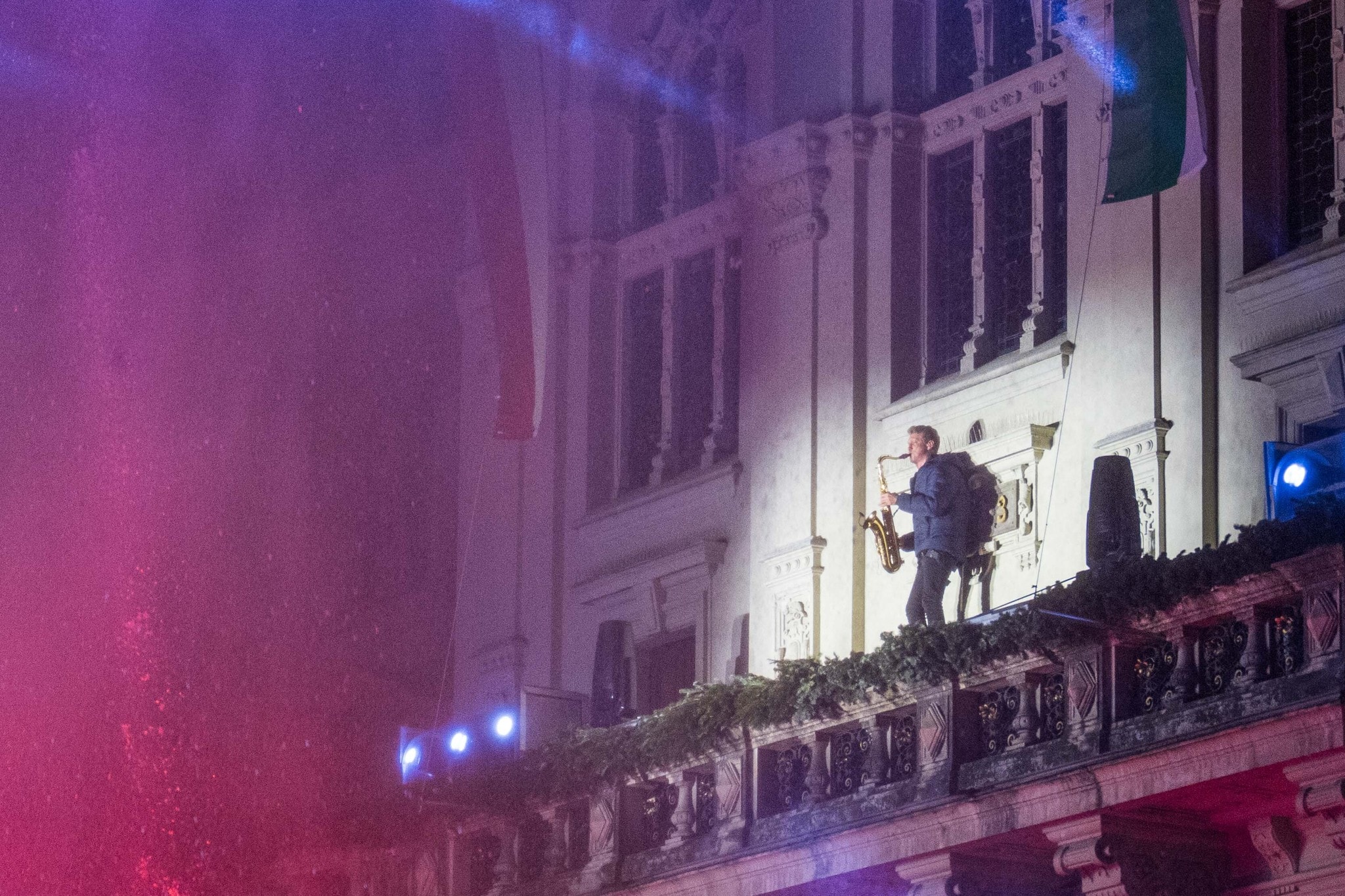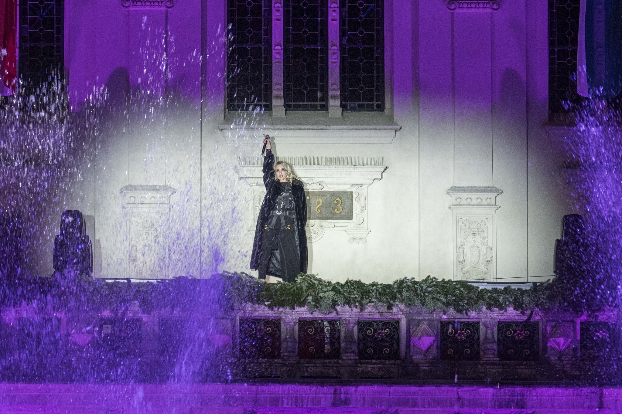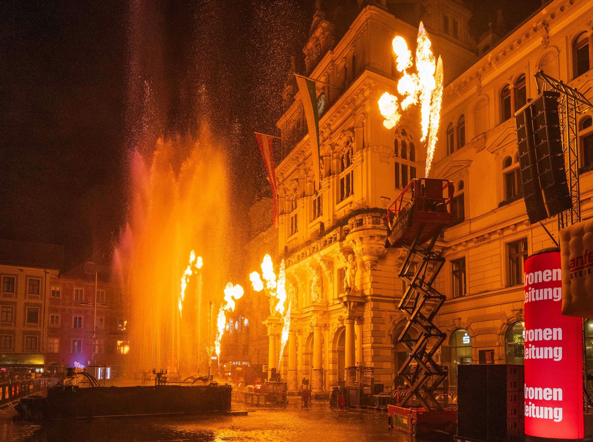Die Sängerin Berenice erscheint hoch oben am Balkon des Rathauses und stimmt „Titanium“ von David Guetta an. Die Steirerin stand schon mit Andreas Gabalier auf der Bühne. Außerdem heizt der Saxophonist Nicolo Loro Ravenni dem Publikum ein. Man kennt ihn von der Band Russkaja, die schon bei „Willkommen Österreich“ für ihre wilde Mischung aus Rock und traditioneller russischen Musik gefeiert wurde. „Die beiden Live-Künstler und der DJ verschmelzen mit der Show aus Licht, Wasser und Feuer“, sagt Markus Lientscher vom Veranstalterteam Ivents.