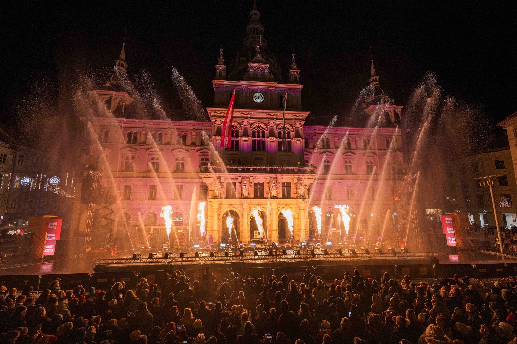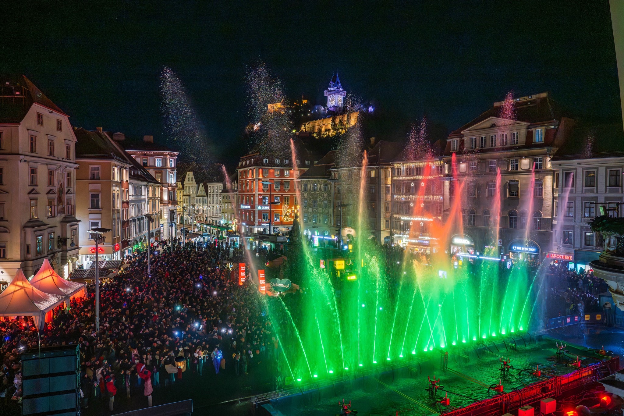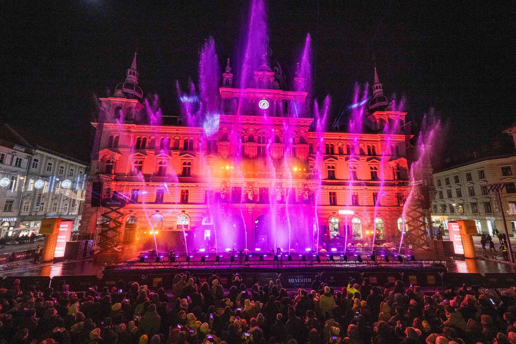 Das Jahr 2025 geht mit einem Spektakel zu Ende. Zigtausende Menschen sind zum Grazer Hauptplatz gekommen, um gemeinsam zu feiern. Und das ganz ohne Pyrotechnik: Den Zuschauern werden fünf spektakuläre Shows mit Wasser, Licht, Feuer und Livemusik geboten – um 17.30 Uhr die erste, um Mitternacht das Grande Finale.