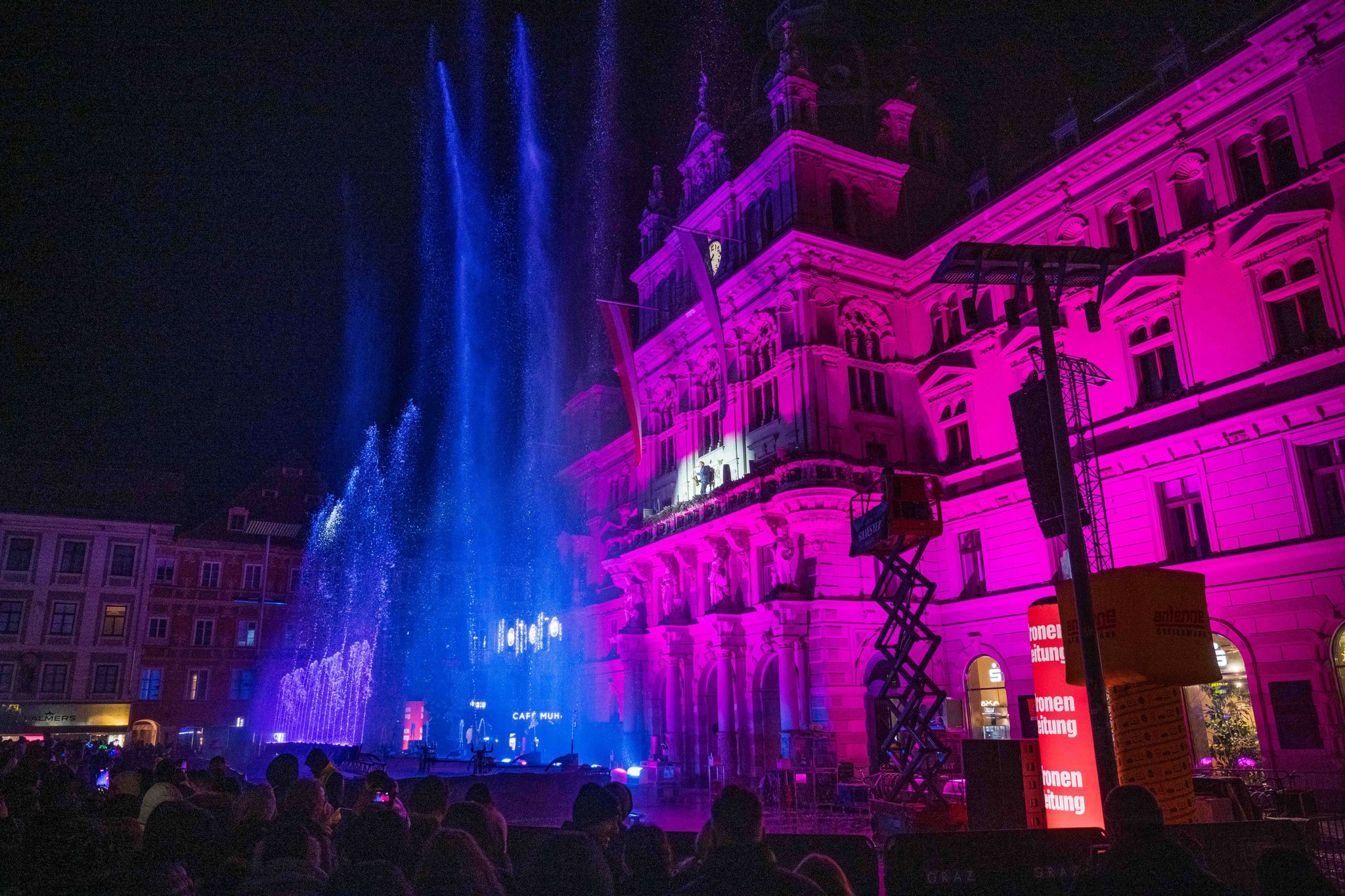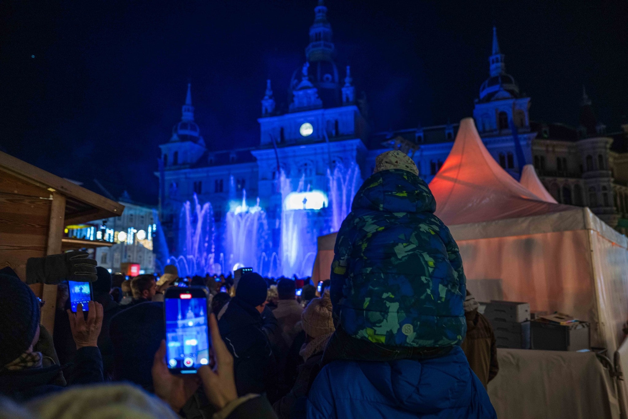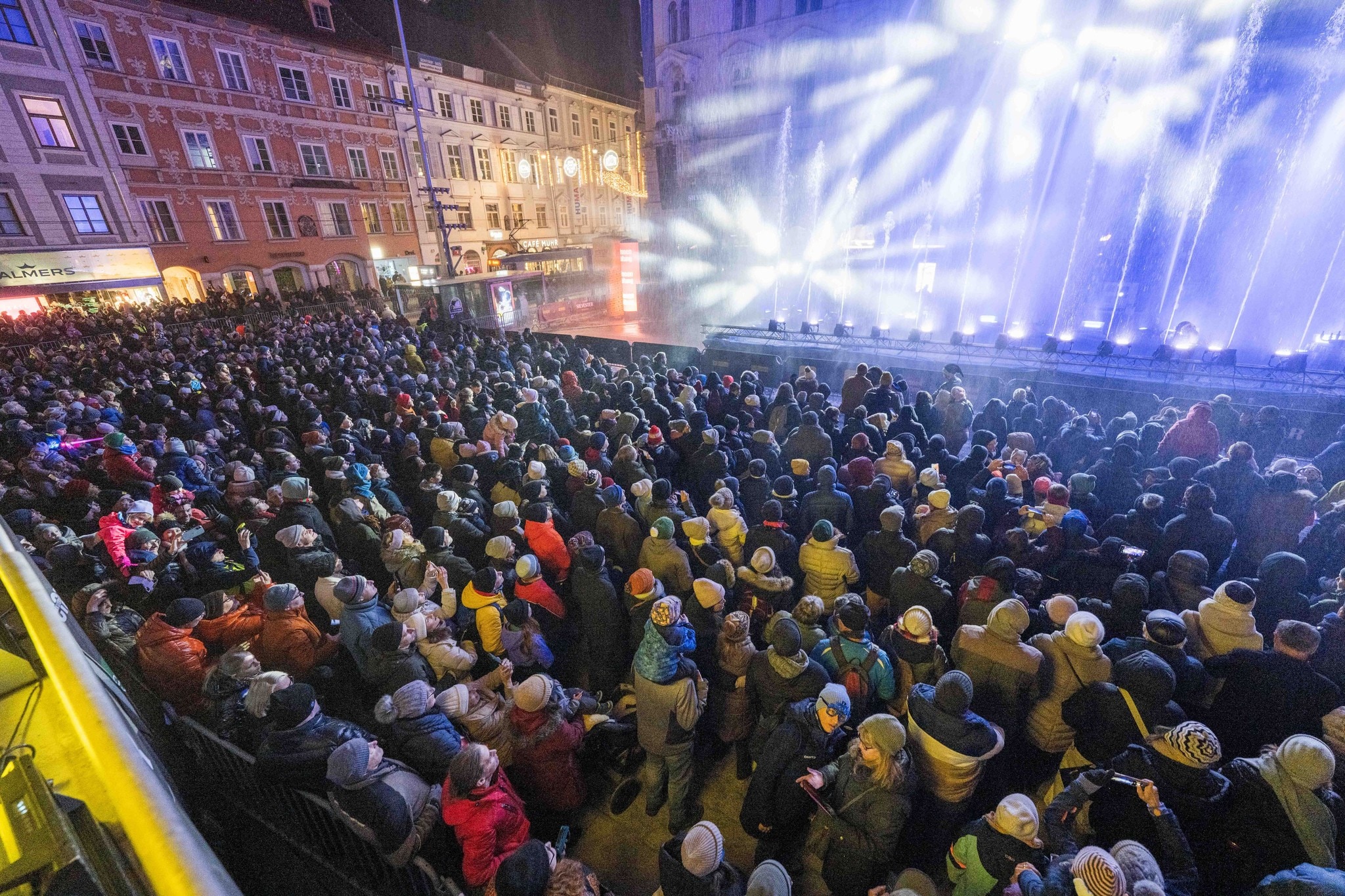 Das Jahr 2025 geht mit einem Spektakel zu Ende. Zigtausende Menschen sind zum Grazer Hauptplatz gekommen, um gemeinsam zu feiern. Und das ganz ohne Pyrotechnik: Den Zuschauern werden fünf spektakuläre Shows mit Wasser, Licht, Feuer und Livemusik geboten – um 17.30 Uhr die erste, um Mitternacht das Grande Finale.