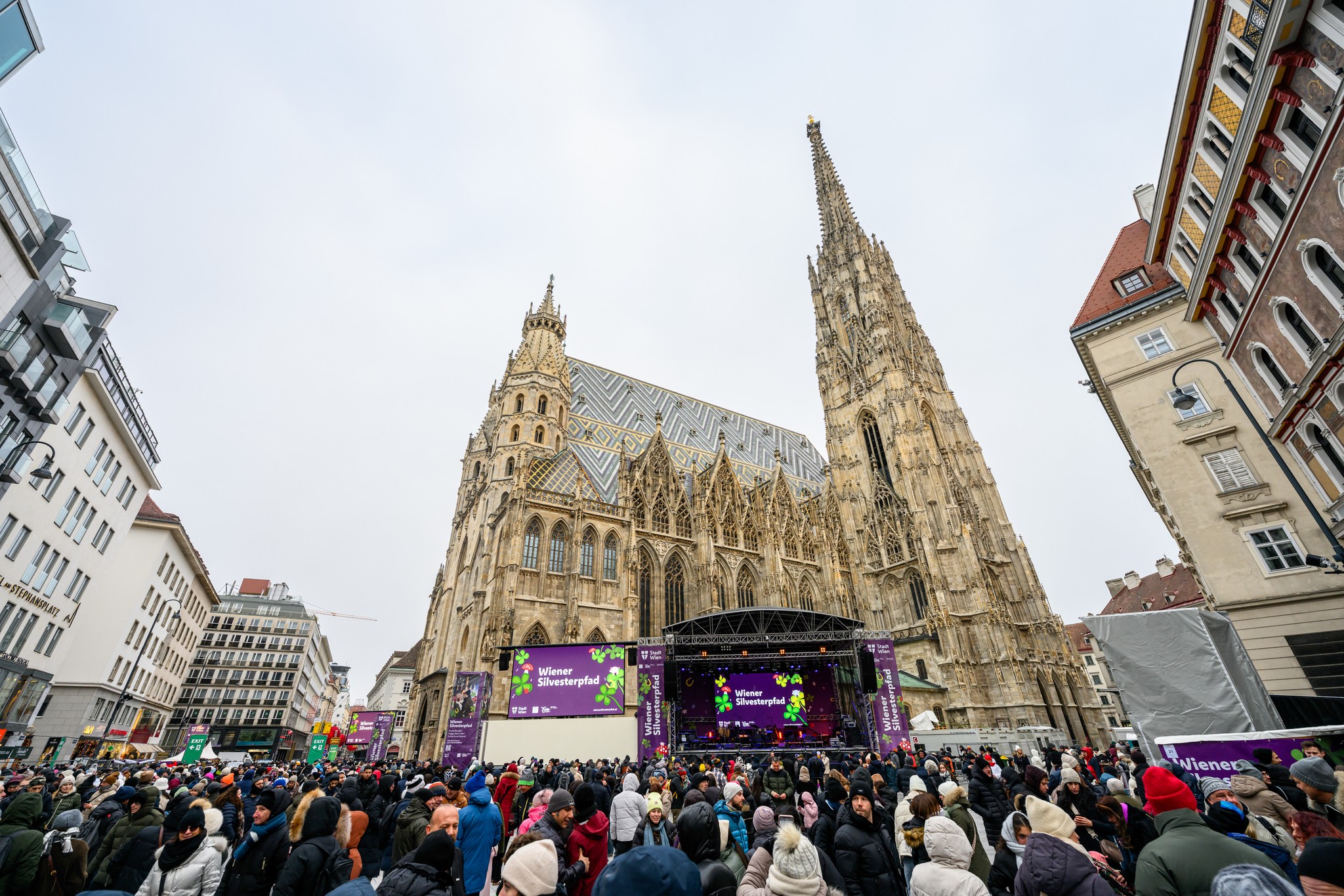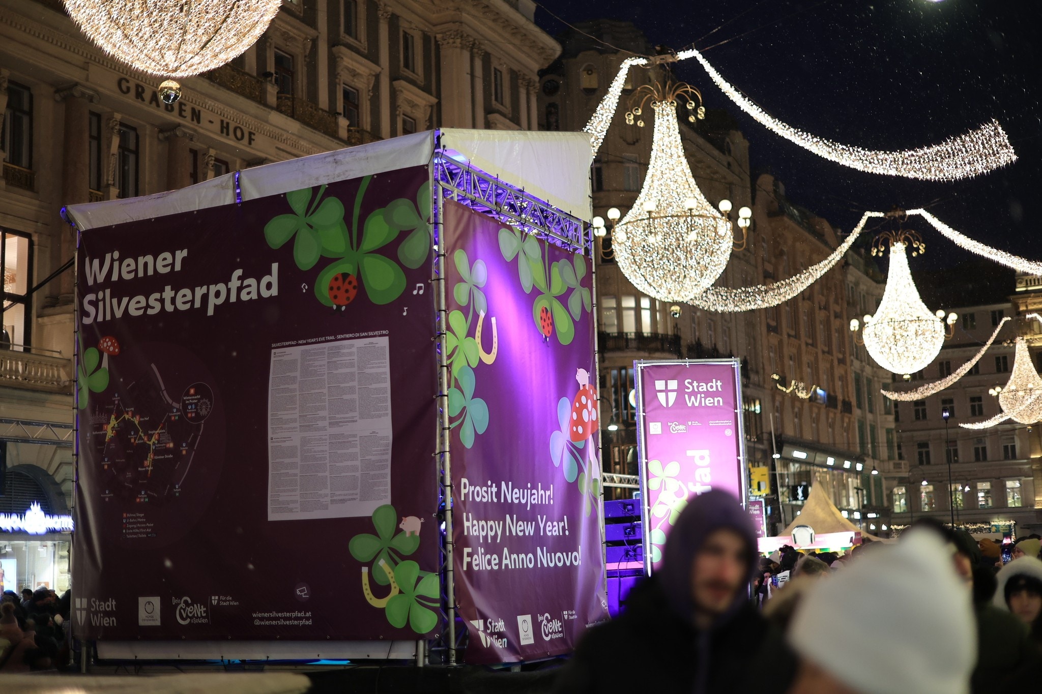 Der Silvesterpfad lud bis 2 Uhr nachts zum Feiern ein. Geboten wurde ein buntes Musikprogramm mit Beats aus allen Stilrichtungen, dazu lockten zahlreiche Gastrostände mit allerlei Schmankerln. Gefeiert wurde nicht nur am Rathausplatz, sondern auch auf der Freyung, Am Hof, Graben, am Stephansplatz, auf der Kärntner Straße und am Neuen Markt.