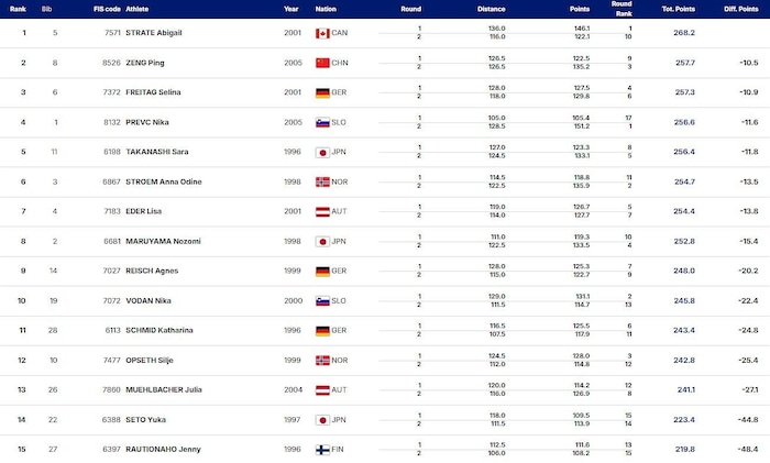 Strate, die im ersten Durchgang das Duell mit Mühlbacher klar gewonnen hatte. Die Kanadierin siegte mit 268,2 Punkten (136/116 Meter) vor Zeng, die an ihrem 21. Geburtstag mit 257,7 Punkten (126,5/126,5) einen historischen Erfolg feierte, und Freitag (257,3 – 128/118).