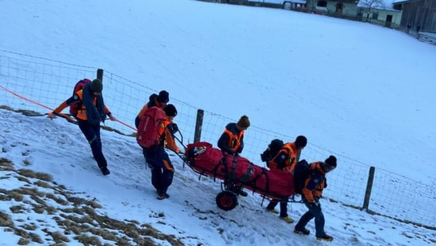 Nach der Erstversorgung wurde sie in einer Unfalltrage zu den Fahrzeugen gebracht, bevor es mit dem Feuerwehrauto in Richtung Tal ging. Dort wurde die Frau an das Rote Kreuz übergeben.