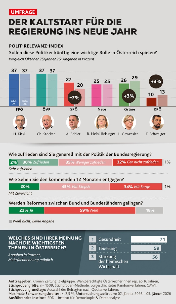 A cold start to the new year for the coalition: according to a survey by the "Krone" newspaper, more than two thirds of citizens are no longer satisfied with the government. Almost 60 percent no longer believe in reforms.