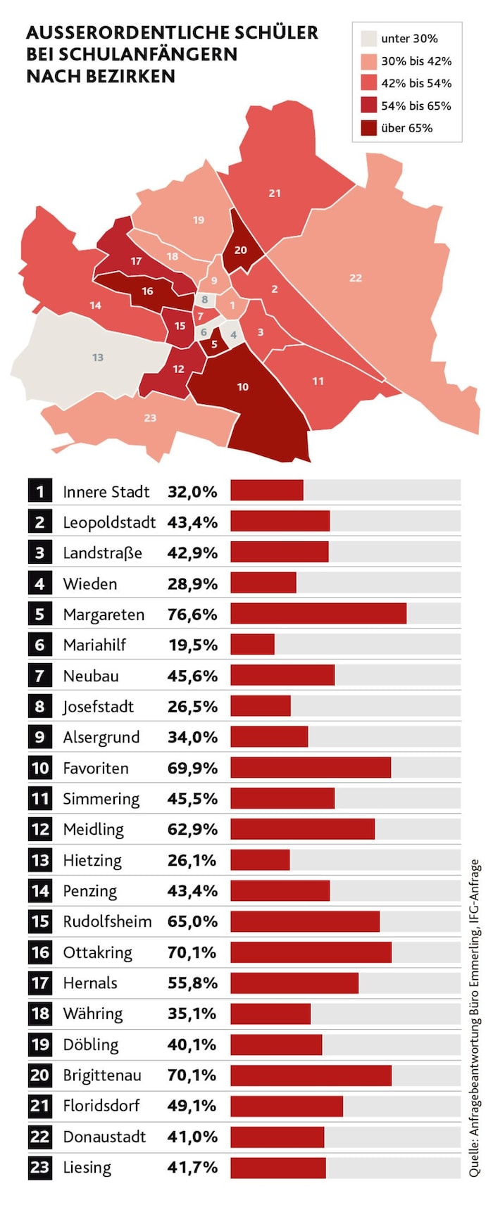 Besonders drastisch zeigt sich die Lage in einzelnen Bezirken. In Margareten beginnen 76,6 Prozent der Schulanfänger ihre Laufbahn als außerordentliche Schüler. In Favoriten, Brigittenau oder Ottakring liegen die Quoten teils jenseits der 70 Prozent. Zierfuß rechnet vor: „In einer durchschnittlichen Klasse mit 22 Kindern verstehen dort oft nur fünf den Lehrer wirklich.“