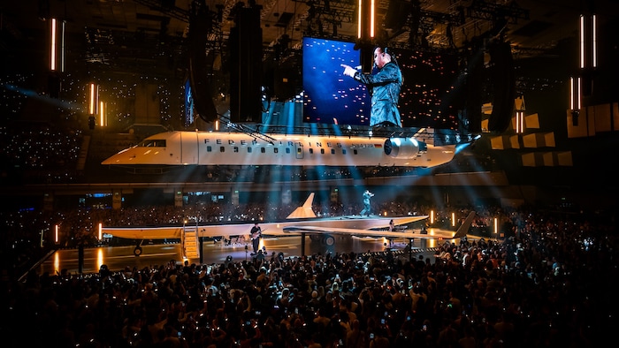 Ein gewisser Grad an Abgehobenheit ist beim 28-Jährigen durchaus legitim. Einerseits ist seine musikalische Verwurzelung tief im Rap zu verorten, wo Bescheidenheit und Demut eher mit charakterlicher Rückständigkeit gleichzusetzen sind, andererseits hat er über die ersten Hits „Kein Problem“ und „Roller“ (gemeinsam mit Eminems „Lose Yourself“ noch immer die bestverkaufte Rap-Single aller Zeiten in Deutschland) von 2019 weg eine Karriere gestartet, die es selbst beim Hype-verliebten Hip-Hop-Publikum so noch nie zuvor gegeben hat. Dass man da gerne mal in anderen Sphären schwebt, ist ganz normal. Insofern ist das opulente Hallenbühnenbild eigentlich nur folgerichtig. So auch die Inszenierung, denn der Flieger lässt sich in zwei Hälften teilen und Apache, der vor dem Konzert noch relativ unbemerkt in einer Box in die Bühnenmitte geschoben wird, entschwebt als Pilot im glitzernden Dienstanzug mit dem Cockpit ins Irdische hernieder, um mit „Ein Lied für dich“ und „Fame“ das Areal früh in Stimmung zu bringen.