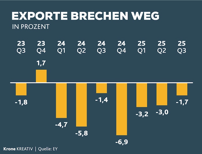Erst am Freitag wurde bekannt, dass die steirische Firma Wollsdorf Leder mit 365 Beschäftigten Insolvenz angemeldet hat. Grund sind die „negativen Entwicklungen in der Automobilzulieferindustrie“. Das passt ins Bild, denn es gibt zwar erste Anzeichen, dass sich die Lage für Österreichs Wirtschaft allmählich etwas bessert. Doch die neuesten verfügbaren Zahlen für das 3. Quartal 2025 zeigen, dass die Industrie zuletzt noch tief in der Krise steckte.