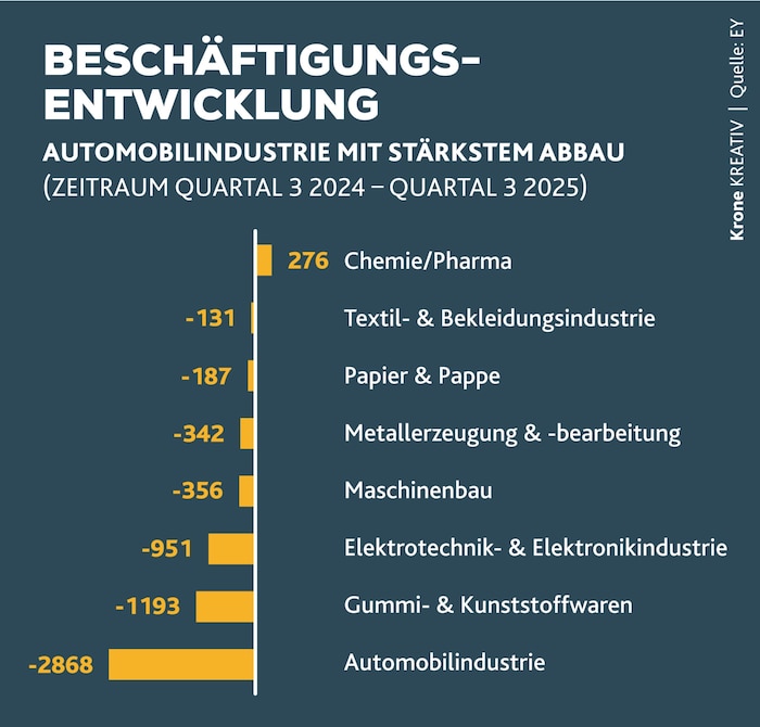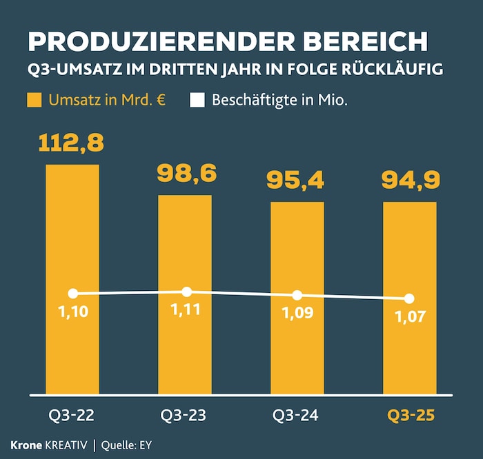 Während die Regierung noch an einer Industriestrategie arbeitet, zeigt die Beratungsfirma EY in einer neuen Studie das ganze Ausmaß der Misere auf: Die produzierende Wirtschaft in Österreich ist nun bereits zehn Quartale in Folge geschrumpft. Innerhalb von zwölf Monaten gingen rund 21.000 Jobs verloren.
