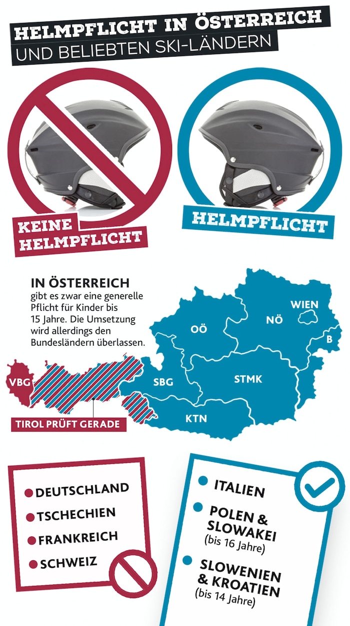 Dabei gibt es in Österreich längst Regeln – nur eben keine einheitlichen. In Salzburg, Oberösterreich, der Steiermark gilt für Kinder bis 15 Jahre eine Helmpflicht beim Skifahren, in der Ostregion und Kärnten zusätzlich auch beim Rodeln. Ausgerechnet Tirol und Vorarlberg bilden hierbei noch die Ausnahme. Während Vorarlberg zumindest empfiehlt, prüft Tirol derzeit schon eine gesetzliche Erweiterung.