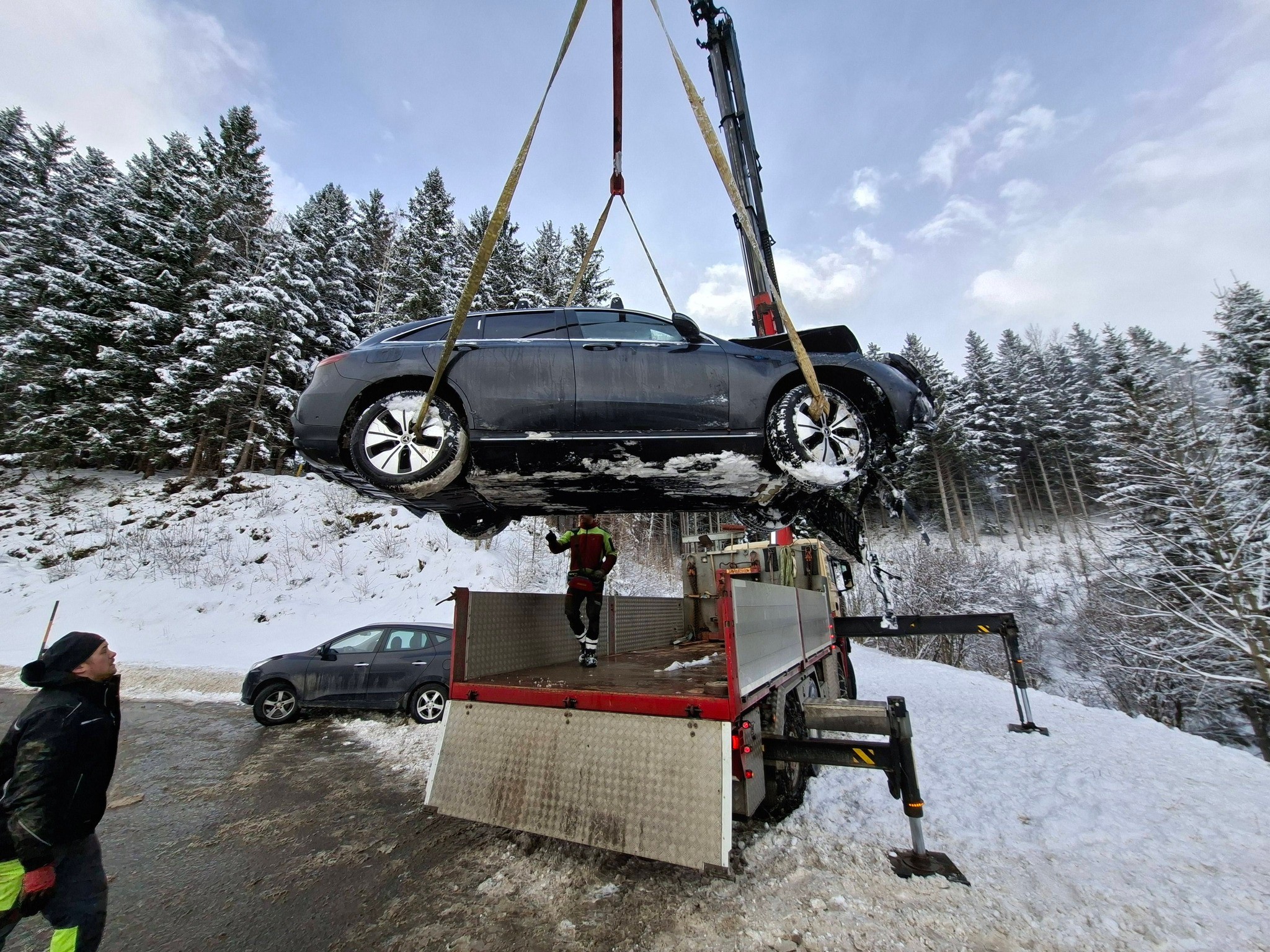 Die Bergung des Fahrzeugs gestaltete sich dann etwas schwieriger. Da es sich um ein Elektrofahrzeug handelte, musste die Firma Arzbacher aus Schladming mit einem Kran anrücken. Die Feuerwehrleute unterstützten bei der Bergung und stellten den Brandschutz sicher.