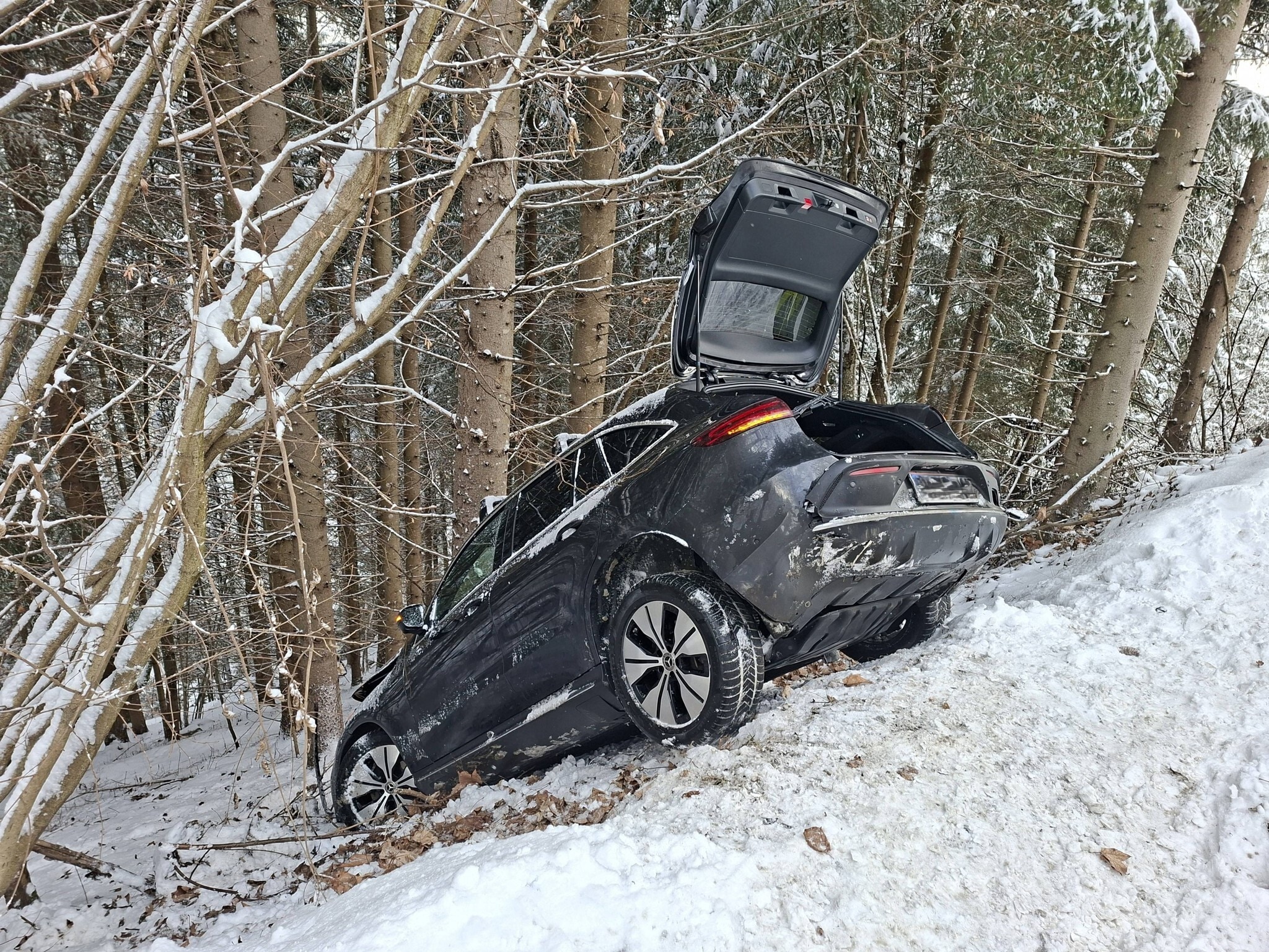 Auf der Planailandesstraße in der Steiermark (Bezirk Liezen) rutschte am Samstag ein Pkw eine steile Böschung hinab und wurde von einem Baum gestoppt. Die Insassen wurden dabei leicht verletzt. Das Fahrzeug wurde mit einem Kran geborgen.