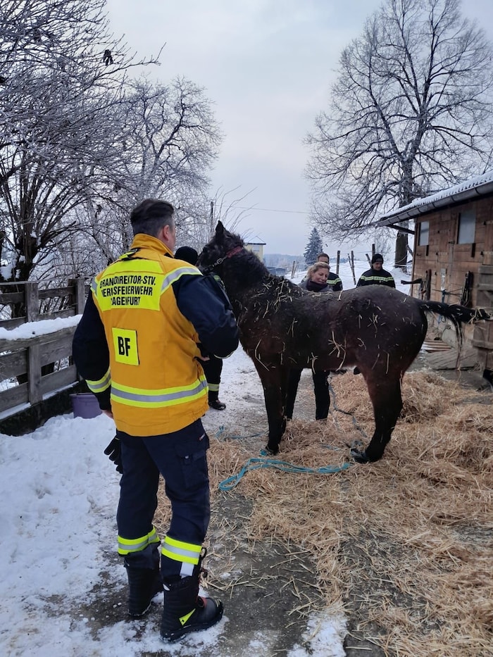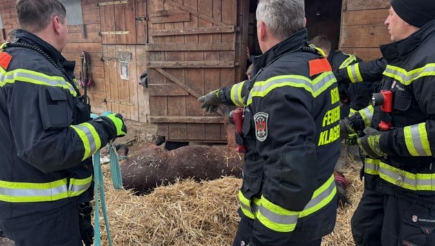 Schwieriger Einsatz Donnerstagfrüh für die Berufsfeuerwehr Klagenfurt: In einem Stall in Gottesbichl war ein Pferd in seiner Box umgefallen und benötigte dringend Hilfe.