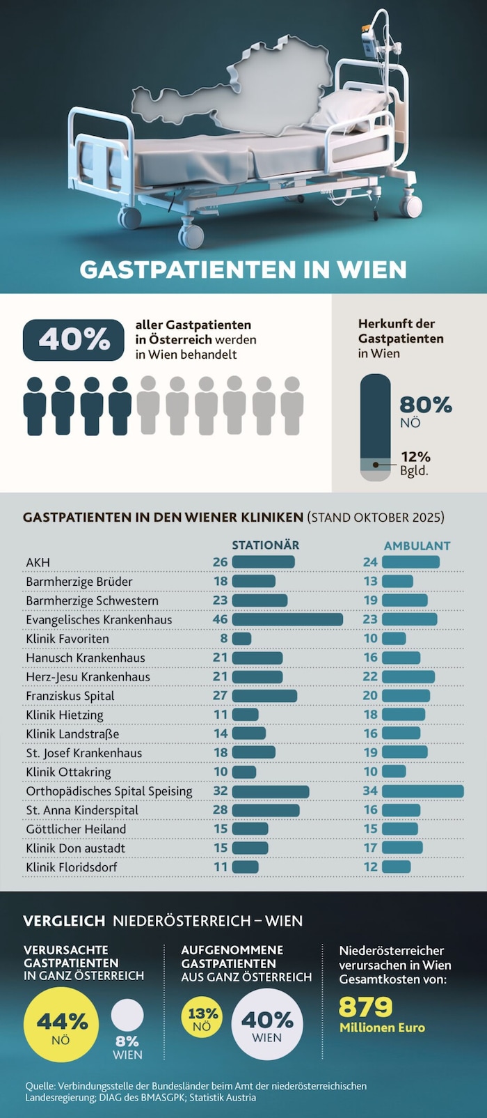 Daher ist die Politik gefordert, rasch eine Lösung zu finden. Der eigentliche Zankapfel bleibt die schiere Dimension. Während Wien nur acht Prozent der Gastpatienten in Österreich verursacht, werden 40 Prozent aller Fälle österreichweit in der Hauptstadt behandelt. Kostenpunkt allein für die Patienten aus Niederösterreich: 879 Millionen Euro 2024.